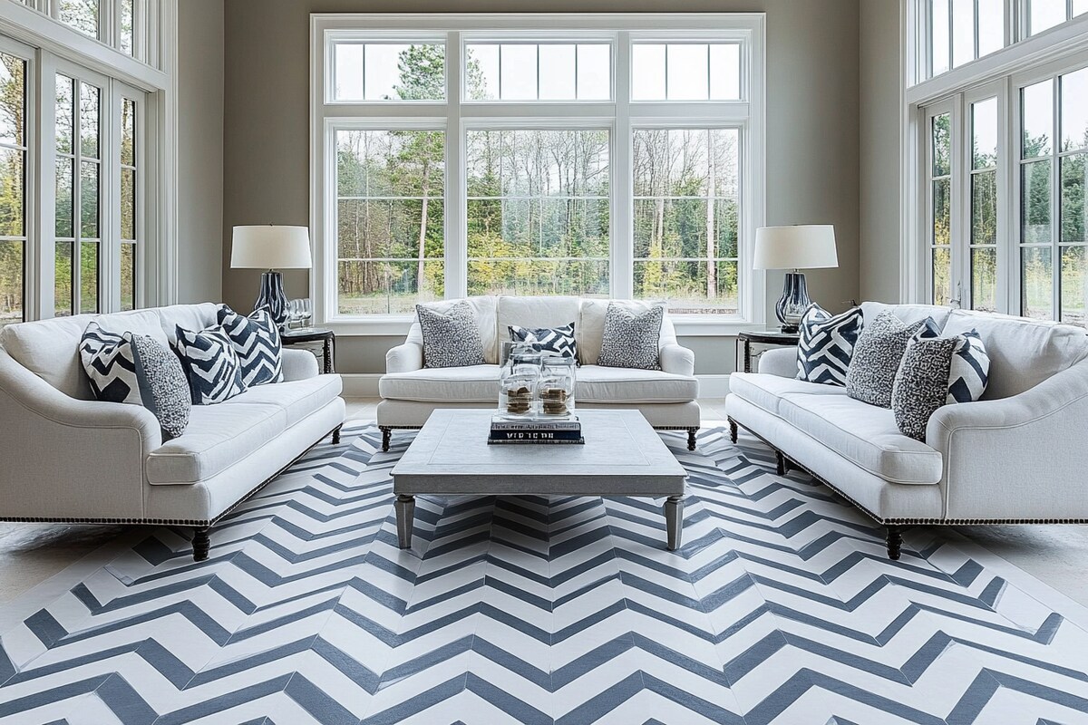 The matte white and grey chevron tiles introduce a playful rhythm to the living room, creating a floor design that feels both structured and dynamic. The sharp angles draw attention, subtly guiding the eye toward the central seating arrangement. These tiles bring a modern edge to the space, yet their neutral tones make them versatile for various decor styles. Pairing them with textured cushions and soft furnishings, like in this image, adds depth without overwhelming the visual balance. For a fresh twist, try adding an oversized plant or a minimal floor lamp to the corners, complementing the pattern with vertical elements. These tiles are perfect for those who want a statement look while maintaining a sense of understated charm.