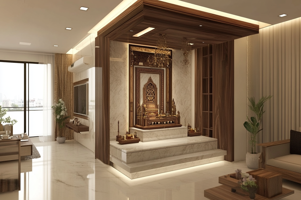 Looking for a pooja space that merges style with a calming vibe? This Contemporary Open Mandir Design in frosty white and rich brown hits the mark. Adding a sleek marble platform gives it a luxurious, clean vibe, while the warm wooden accents add depth and tradition. The detailed carvings on the mandir offer a beautiful nod to classic design, and the open layout keeps the space feeling light and airy. Plus, the soft lighting creates a balanced atmosphere for your daily rituals, effortlessly combining modern sophistication with a timeless spiritual essence.