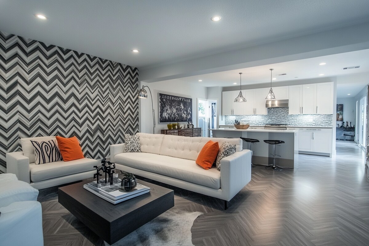 The grey and white chevron backsplash tiles bring an energetic vibe to the room, creating a striking geometric rhythm that stands out. This pattern transforms the wall into a statement feature while maintaining a modern and balanced aesthetic. Paired with neutral tones and clean lines in the furniture, these tiles work as an anchor to tie the space together. For a fresh twist, consider incorporating light wood or metallic accents in the decor to add a layer of contrast and texture. This chevron design doesn’t overpower but instead complements a contemporary space, making it versatile for open-plan layouts like this one. It’s an excellent choice for anyone aiming to highlight a unique pattern without overwhelming the overall design.